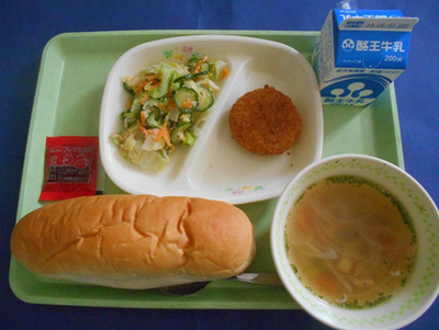 コッペパン 牛乳 いちごジャム プレミアムカレーコロッケ キャベツとツナのサラダ 大豆スープ