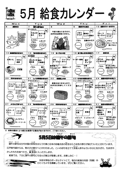 5月5日は、こどもの日です。もちをくるんでいる柏(かしわ)の葉は、新しい芽が出ないと古い葉が落ちないので「子孫(しそん)繁栄(はんえい)」を意味する縁起(えんぎ)の良い食べ物とされ、食べるようになりました。健康で大きくなれるように祈りながら、端午(たんご)の節句(せっく)にちなんだ献立をいただきましょう。