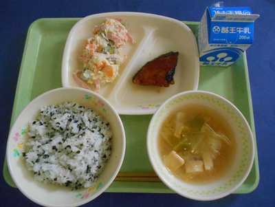 わかめごはん 牛乳 かつおの揚げ浸し ポテトサラダ キャベツのみそ汁