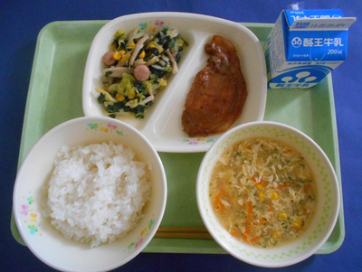 ごはん 牛乳 ポークケチャップ しめじと野菜のバターソテー とうもろこしのスープ