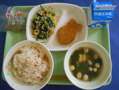 たけのこごはん しめじ汁 魚すり身カツ やまぶきあえ 牛乳 かしわもち