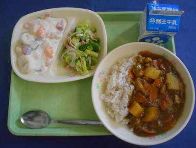 チキンカレーライス(麦ごはん) ブロッコリーサラダ フルーツヨーグルト 牛乳