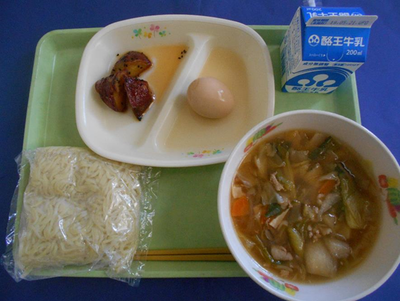 2019年5月13日 12時07分広東麺 手作り煮卵 大学いも 牛乳