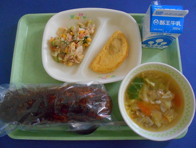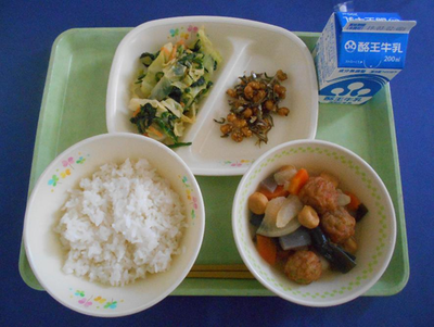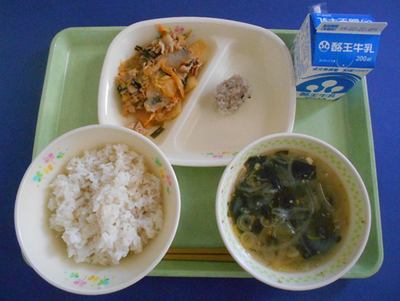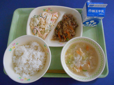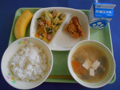 今日の献立は、3年2組の希望献立です。献立のねらいは、「みんなが好きなから揚げを取り入れた」です。から揚げはみなさん大好きなメニューだと思います。しょうゆ・酒・しょうが・にんにくで下味をつけて、片栗粉をまぶして揚げるだけで出来上がります。ぜひお家でも作ってみてください。