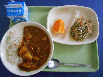 チキンカレーライス(発芽玄米ごはん) 牛乳 ジャコサラダ 国産オレンジ(スウィートスプリング)