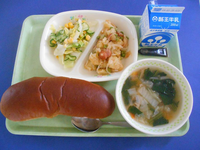 ココア揚げパン 牛乳 ミートオムレツ ツナサラダ キャベツのスープ