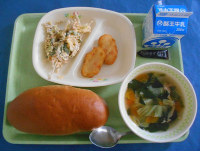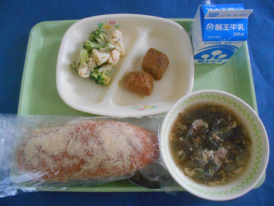 黒糖パン 牛乳 ミルメーク 豆腐のナゲット ごぼうサラダ ほうれん草スープ