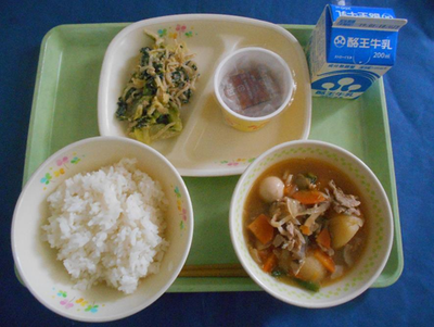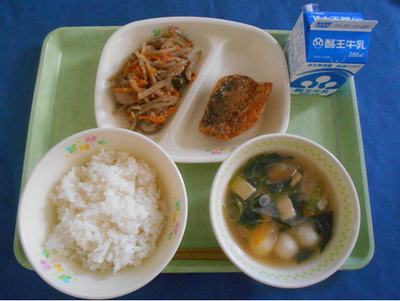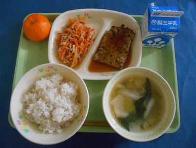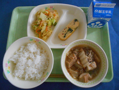 自分たちが住んでいる地域でとれる食べ物を地場(じば)産物(さんぶつ)といい、それを地域で消費することを地産地消(ちさんちしょう)といいます。今日の給食では、牛乳・卵は福島県産、米・大根・人参・キャベツ・白菜・ねぎが矢吹町産です。福島県内、矢吹町の生産者が心を込めてつくった食材を味わっていただきましょう。
