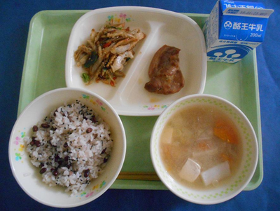 小豆ごはん 牛乳 鶏肉の照り焼き 揚げごぼうのごまだれがけ いものこ汁