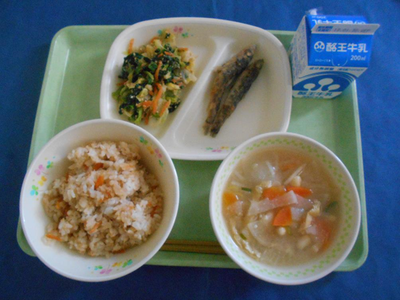 ツナごはん 牛乳 めひかりのから揚げ ほうれん草のごまあえ 大豆入りみそ汁