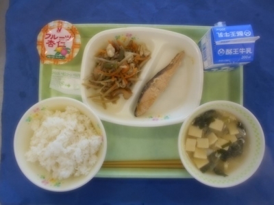 ごはん 牛乳 サケの香味焼き 五目きんぴら 凍み豆腐のみそ汁 フルーツ杏仁