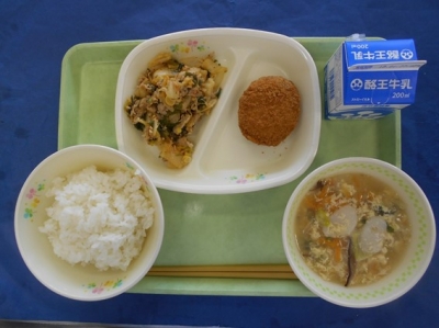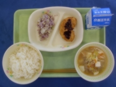 ごはん 牛乳 白花豆コロッケ(ソース) 白菜のゆかり漬け 豚汁
