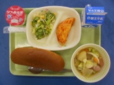 黒糖パン 牛乳 プレーンオムレツケチャップソースかけ イタリアンサラダ
