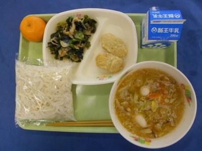 肉みそうどん 牛乳 豆腐ナゲット おひたし ポンカン