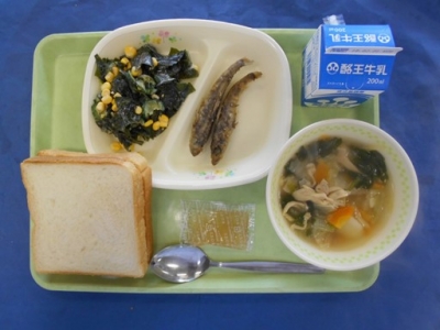 食パン 牛乳 梨ジャム めひかりの唐揚げ わかめサラダ 野菜スープ