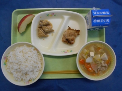 ごはん 牛乳 鶏肉のごまみそ焼き ゆずみそこんにゃく けんちん汁 りんご