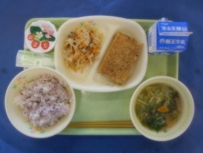 麦ごはん 牛乳 イカカツごまフライ(ソース) うの花炒り 白菜のみそ汁
