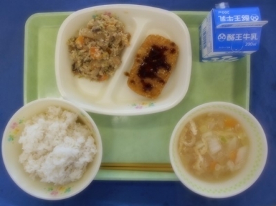 カレーピラフ 牛乳 鶏肉の照り焼き チーズサラダ 星のスープ セレクトデザート