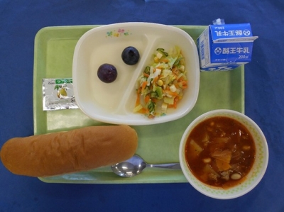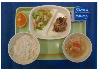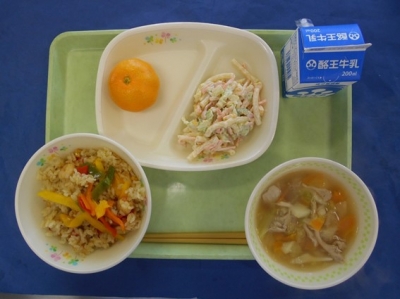 パエリア 牛乳 マカロニサラダ 野菜スープ みかん