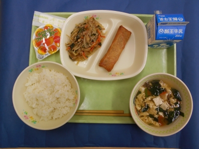 ごはん 牛乳 春巻き もやしのひき肉炒め 中華スープ アプリコットゼリー