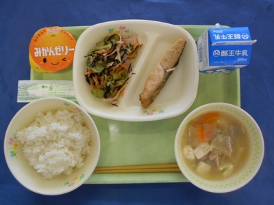 ごはん 牛乳 サケのごまみそ焼き ひじきサラダ 豚汁 みかんゼリー