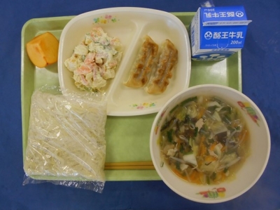 五目タンメン 牛乳 ギョウザ ポテトサラダ 柿