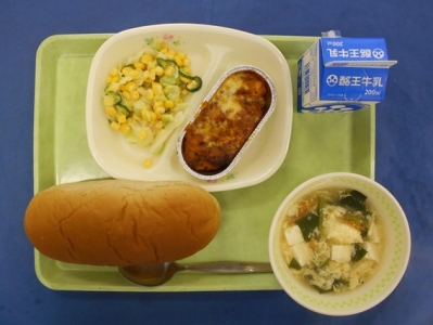 黒糖パン 牛乳 ミートグラタン コーンサラダ むらくもスープ