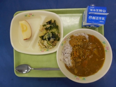ポークカレーライス(十穀米) 牛乳 わかめとツナのサラダ りんご