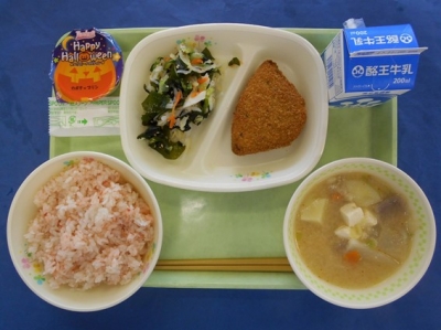 ごはん 牛乳 豚みそカツ 茎わかめのきんぴら 白菜のみそ汁 シークワーサーゼリー