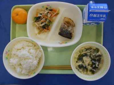 ごはん 牛乳 サバの塩焼き もやしのラー油あえ 卵スープ みかん