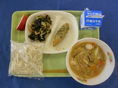 肉みそうどん 牛乳 笹かまの磯部揚げ おひたし りんご