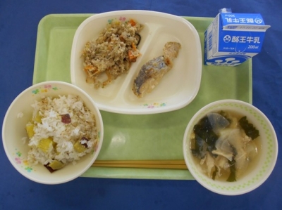 さつまいもごはん 牛乳 白身魚の薬味焼き うの花炒り 大根のみそ汁