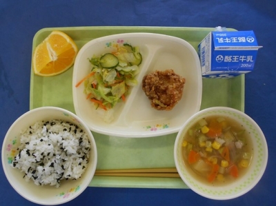 わかめごはん 牛乳 鶏のから揚げ フレンチサラダ コンソメスープ オレンジ