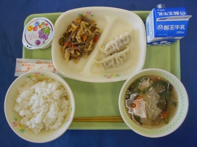 ごはん 牛乳 ギョウザ チンジャオロースー ワンタンスープ ぶどうゼリー