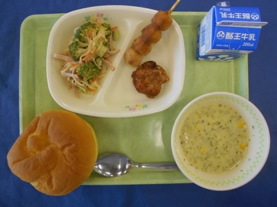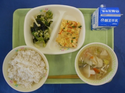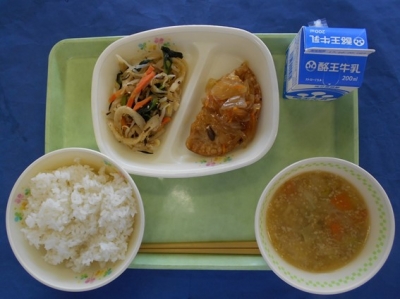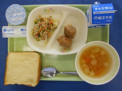 今日は中華風の給食です。肉みそスープには豚ひき肉を使っていますが、