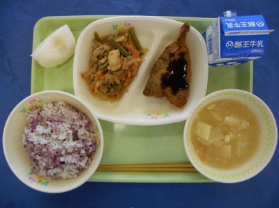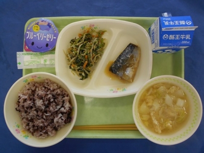 黒米ごはん 牛乳 サバのみそ煮 ごまあえ 白菜のみそ汁 ブルーベリーゼリー