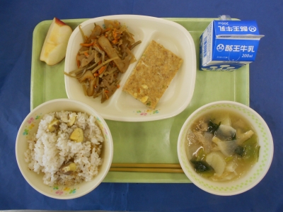 栗ごはん 牛乳 松風焼き 五目きんぴら 小松菜汁 りんご