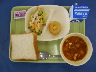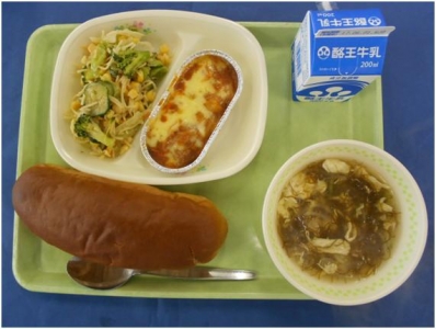 黒糖パン 牛乳 ミートグラタン サラスパ もずくスープ