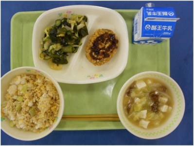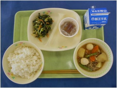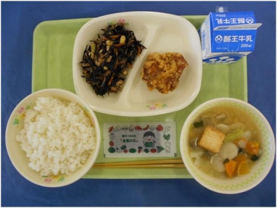ごはん 牛乳 鶏唐揚げ ひじきの炒め煮 すいとん汁 味付けのり