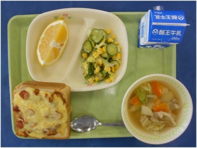 スパゲティミートソース 牛乳 枝豆フリッター フレンチサラダ ニューサマーオレンジ