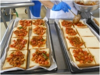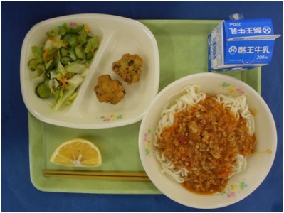 スパゲティミートソースはゆでてもらった麺に給食室で調理したミートソースをかけて食
