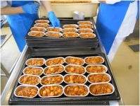 ミートグラタンの具をカップに入れます。 上にチーズをかけます。→ オーブンへ