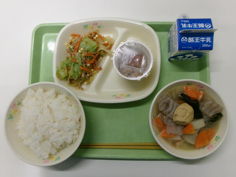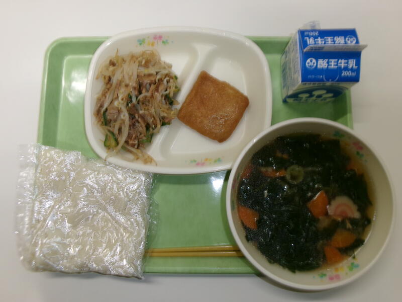 力うどん(味付きもちいなり) 牛乳 もやしの香味あえ
