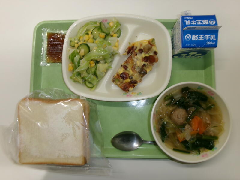 食パン 牛乳 いちごジャム 手作りキッシュ フレンチサラダ 白菜と肉団子のスープ