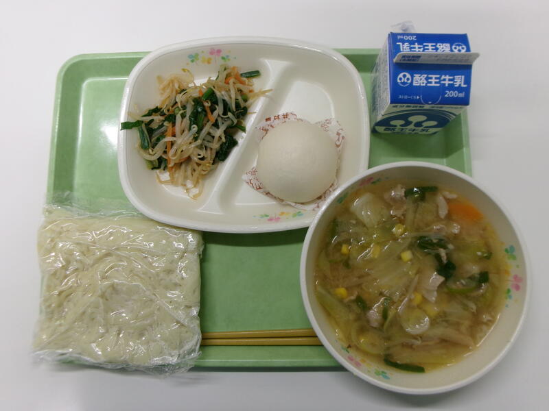 みそラーメン 牛乳 ミニ肉まん もやしのラー油あえ