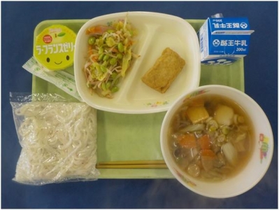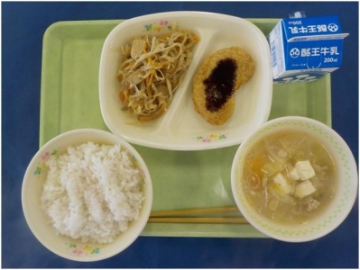 麦ごはん 牛乳 豆コロッケ(ソース) 切り干し大根の炒め煮 豚汁