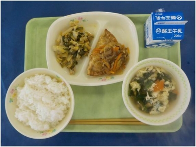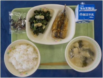 ごはん 牛乳 いわしのかば焼き 春菊のごまあえ 凍み豆腐のみそ汁 福豆