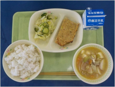 麦ごはん 牛乳 松風焼き 白菜の浅漬け けんちん汁