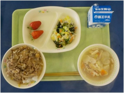 2017年2月10日 08時02分豚丼 牛乳 もみ漬け すいとん汁 いちご