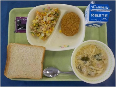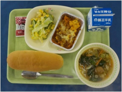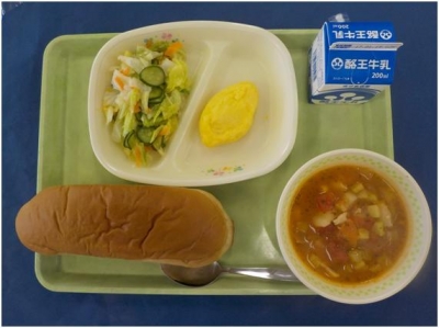 黒糖パン 牛乳 チーズオムレツ フレンチサラダ ミネストローネ